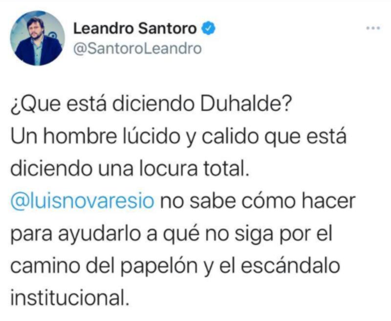 — América TV (@AmericaTV) August 25, 2020Los dichos del mandatario inundaron de inmediato Twitter, entre el asombro, las especulaciones y algún que otro rechazo contundente a su mensaje. “Duhalde derrapó mal. El Frente de Todos llegó para hacerse cargo de poner de pie a la Argentina , escribió la diputada Cecilia Moreau, vicepresidenta de ese bloque partidario. “Gravísimo lo de Duhalde, absolutamente repudiable. Vamos a garantizar la democracia, de una forma u otra. Como manda la Constitución , tuiteó el liberal Yamil Santoro, presidente del Partido Mejorar. “No hay que jugar el juego que propone Duhalde , escribió el ex jefe de Quebracho, Fernando Esteche. “¿Qué está diciendo Duhalde? Un hombre lúcido y cálido que está diciendo una locura total. @luisnovaresio no sabe cómo hacer para ayudarlo a que no siga por el camino del papelón y el escándalo institucional , sugirió el kirchnerista Leandro Santoro, aunque unos minutos más tarde borró ese tuit.