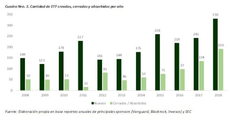En parte por la crisis financiera y por otro lado por lo que vendría más adelante en el tiempo: la enorme dificultad en la industria del “asset management de generar ingresos orgánicos. Antes del 2011, el promedio de ETFs cerrados o absorbidos eran 50 por año, luego se incrementó a 100 mientras que el promedio anual de creaciones se mantuvo en 150. En 2018 se crearon 350 ETP a la par que cerraron 200. De hecho, las firmas Deustche Bank, WisdomTree y Fidelity “cerraron casi un total 40 productos por falta de dinero bajo administración y poco volumen de operatoria, entre otras razones. En suplencia nacieron inversiones exóticas como bitcoins, responsabilidad social empresaria, cannabis, disminución de peso, entre tantos otros.