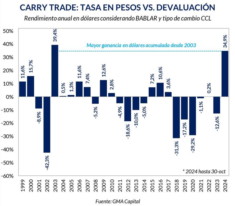 Aquellos que "la vieron" desde el primer momento, se ufanan de haber conseguido ganancias acumuladas de casi 35% en dólares solo este año, resultado prácticamente imposible de obtener con ninguna otra inversión y solo superado por el 39,4% que se consiguió en todo 2003, según los datos registrados por GMA Capital.