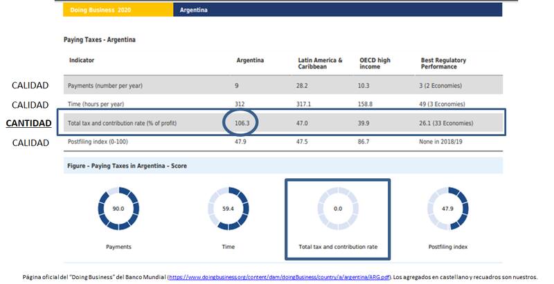 Pues bien, lo que el Banco Mundial le está diciendo a nuestro país con esa calificación “0,0 es que con ese grado de carga fiscal, la Argentina no tiene algo que merezca denominarse “sistema tributario . Y, después de más de 10 años, también que no ha tenido la capacidad de dictarse normas propias de un sistema fiscal (sistema tributario y, su otra cara de la moneda, el gasto público).