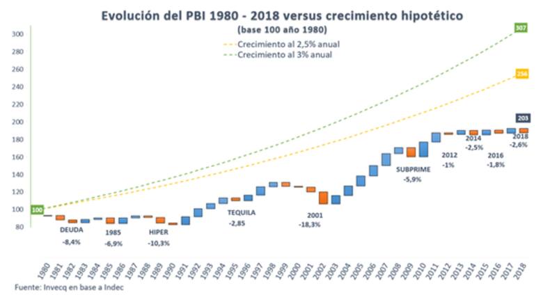 Hablar de crecimiento económico en Argentina es hablar de una verdadera tragedia. Solo una estadística sirve para dimensionar la magnitud de este drama. Si la eventual recuperación del 2019 no es lo suficientemente fuerte como para contrarrestar el arrastre estadístico que dejó la crisis del año pasado, tendremos la deshonra de anotar la contracción del PBI número diecisiete desde 1980 a la fecha. O sea, 17 años recesivos sobre 40 (entre 1980 y 2019), lo cual nos ubicaría en el segundo lugar del podio como el país del mundo con más años recesivos detrás de Libia que acumula 18. El podio lo completa nuestro socio revolucionario, Venezuela, con 16 caídas en idéntico periodo. Basta analizar el desempeño de los otros países de la región para dar cuenta de la magnitud de este bochorno: Uruguay 8, Brasil y Perú 7, Bolivia 5 y Chile 4. Y si queremos ser más exigentes, podemos mencionar a Canadá y Nueva Zelanda con 3 o a Australia con 2.