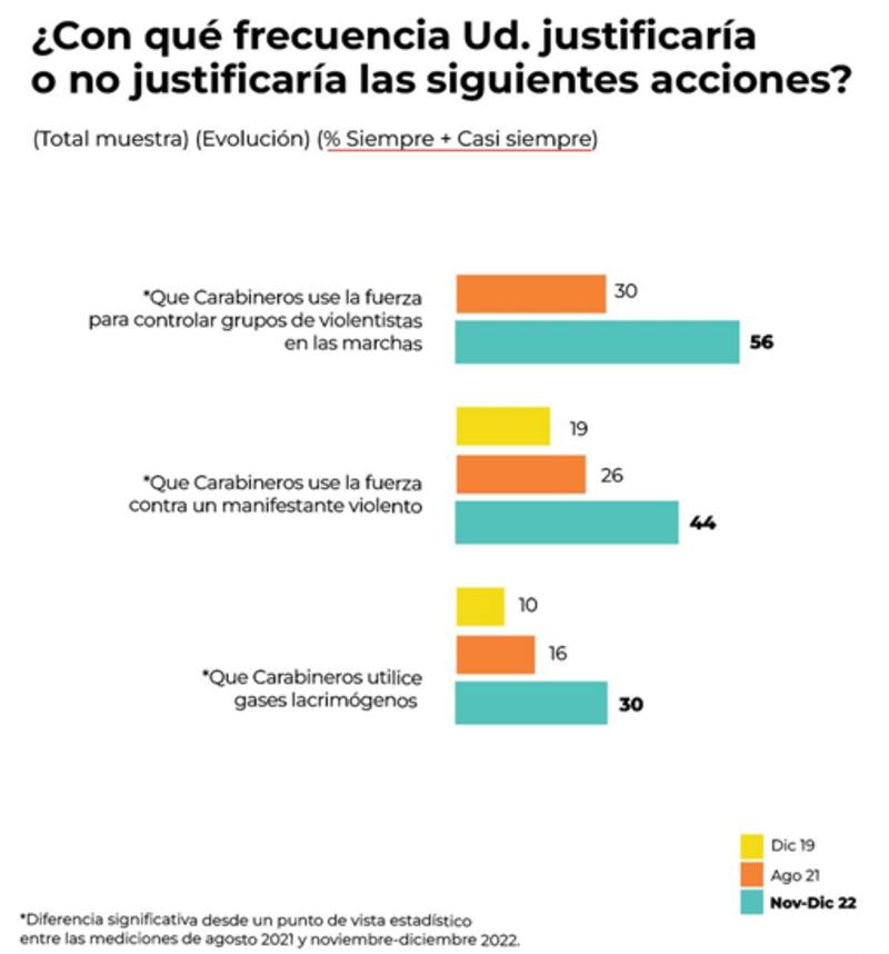 Como el efecto rebote de un antiácido, luego del estallido social donde la ciudadanía protestó contra la clase política y las instituciones, hoy la gente clama por más seguridad al extremo de sacrificar libertades individuales con el fin de restituir el orden público que tanto supo ostentar la sociedad chilena. Un 56% de los encuestados aprobaron que carabineros utilice la fuerza para disuadir a grupos violentistas en las marchas, por ejemplo.