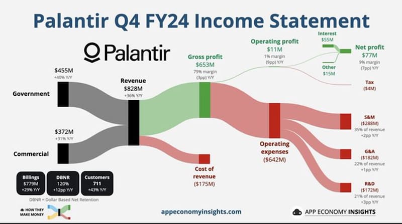 Sus resultados fueron buenos, superando las expectativas. En términos netos, Palantir logró una ganancia de USD 77M, pero el 70% provino de intereses y otros ingresos no operativos, dejando solo USD 22M de ganancias reales de su negocio principal.