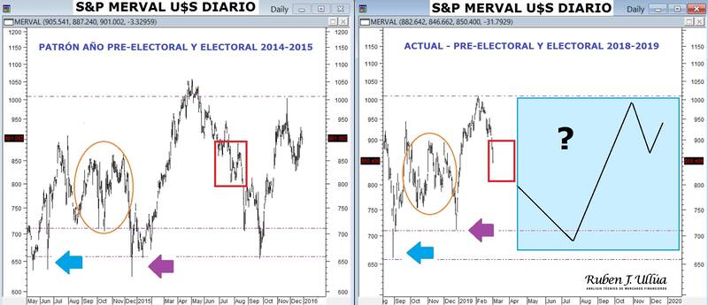 A partir de estos mínimos se inicia un importante movimiento de avance para la bolsa argentina que se extiende hacia instancias de u$s 1000 hacia el primer cuatrimestre del año electoral 2015, para desde entonces volver a ceder posiciones y regresar pocos meses más tarde hacia instancias de mínimos previos de u$s 700-650. Y a partir de septiembre del 2015 se inicia un nuevo segmento de subida que termina en diciembre con la asunción del nuevo presidente.