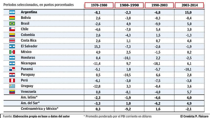 Desde principios de los años setenta, la participación salarial en la creación de riqueza tuvo un desempeño desfavorable en Argentina. Hubo algunos períodos de recuperación: de 1977 a 1980; de 1983 a 1987, luego de la hiperinflación hasta 1993 y entre 1997 y 2001. Pero la tendencia general fue descendente en extremo al inicio de la dictadura y en forma de serrucho ascendente hasta 2001. La participación salarial en 2002 y 2003 fue tan baja como las de 1977, 1982 o 1989 A partir de 2004 se inicia poco más de una década de intenso incremento con disminuciones en 2010, 2014 y 2016.