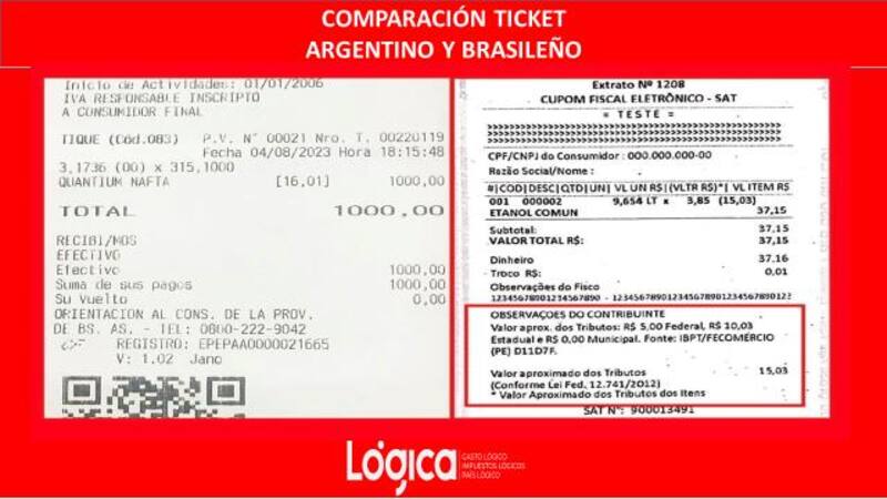 En Brasil se consideran ocho tributos, cuyos equivalentes en Argentina serían los siete mencionados. Se los expone por subtotales nacional, provincial y municipal y el total de tributos. El ciudadano ve los impuestos que paga y a quiénes se los paga y exigirle. Si no son expuestos, se aplica una sanción. Proponemos que, a opción del vendedor, también se informe la carga fiscal total comprendida en el precio final (el 40% a 60% ya mencionado), lo que incluiría, además, seguridad social e impuesto a las ganancias del vendedor, ambos sancionados en la ley pero vetados por Dilma Roussef por "difícil implementación".