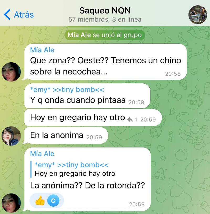 Basta un rato con el celular para encontrar también "Saqueo NQN" con citas a "un chino sobre la Necochea" o la afirmación de que "En Gregario hay otro", a lo que alguien pregunta "¿La Anónima, el de la rotonda?", a lo que le responden "sí".