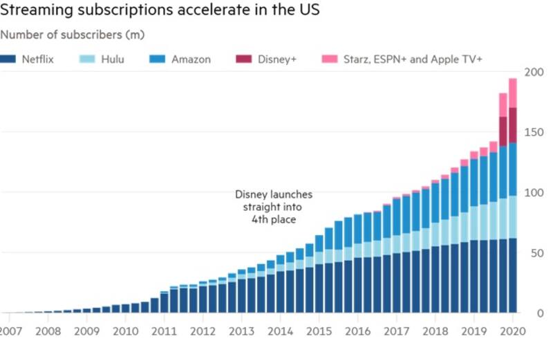 Y si bien la cuarentena benefició a Netflix en cuanto al aumento de suscriptores, también lo hizo con sus competidores. Por ejemplo, Disney+ fue lanzado en noviembre del 2019 y al día de la fecha tiene un cuarto de los suscriptores de Netflix. En sólo dos meses pasó de 25 a 54 millones. Y Amazon Prime Video ya tiene más de 150 millones de suscriptores.