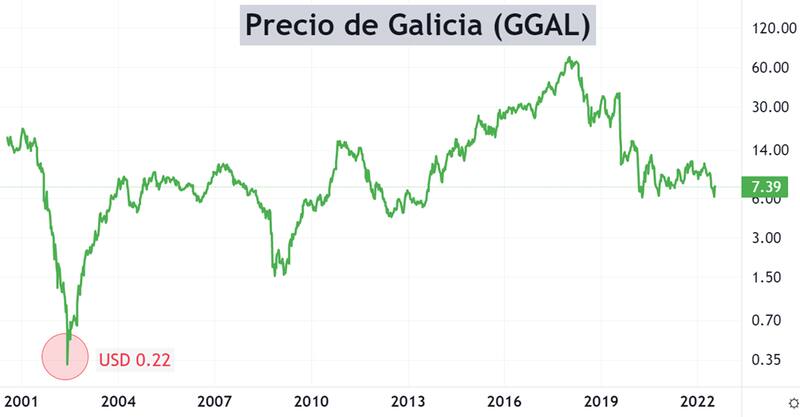 Actualmente, Galicia está cotizando en la zona de los u$s 7,4, cerca de los mínimos de 2004, 2006, 2013 y 2020. Sin embargo, vale aclarar que post crisis del 2001 llegó a cotizar a u$s 0,22. ¿Significa que va a caer hasta ahí?