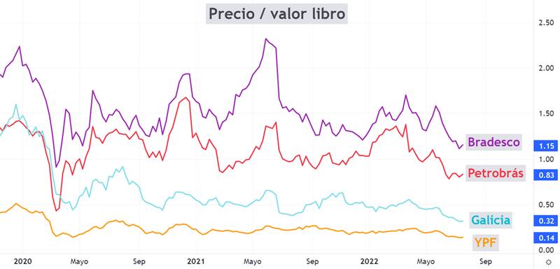 La Argentina está barata, de eso no hay dudas, sea cual fuere la métrica utilizada. Compartamos un gráfico que compara el precio de mercado en relación a su valor de libros (P/B: price to book). Tomé los ejemplos de Galicia e YPF, junto a sus pares de Brasil: Banco Bradesco y Petrobras.
