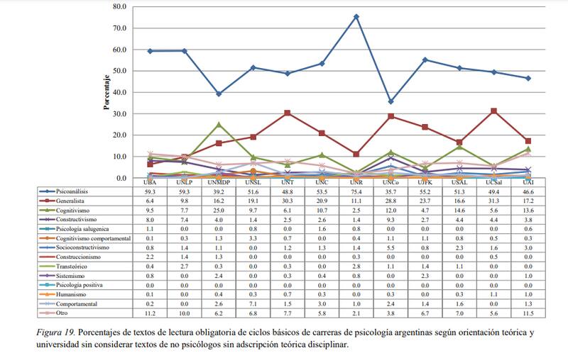 Según un análisis bibliométrico de las carreras de psicología en Argentina entre 2009 y 2015, realizado por Catriel Fierro en la Universidad Nacional de Mar del Plata, tanto facultades privadas como públicas registran predominio del psicoanálisis (entre un 52 y un 59% de las referencias). Freud, por supuesto, es el autor más citado por lejos durante toda la formación.