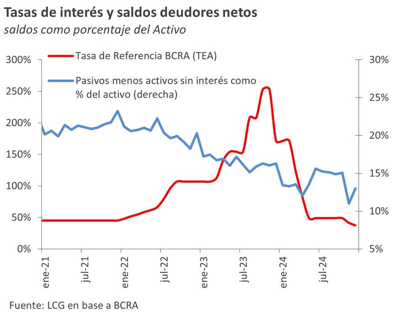 El impuesto cobrado por los bancos saltó a 17% del activo en 2022, y a 29% del activo en 2023, triplicando el ROA de aquel año. Mejor dicho, si no hubiera existido ese nivel de cuentas a la vista sin costo, los bancos probablemente hubieran tenido pérdidas si no modificaban fuertemente algunas decisiones de precios y tasas. En el 2024, el impuesto inflacionario es posible que termine en un valor cercano a 10% del activo, pero ya a fines de año está mostrando un resultado cercano a 5% del activo dado que las tasas (efectivas) anuales se ubican por debajo del 40%. Para 2025, estos enormes valores cobrados quedarán en el olvido y los ingresos de los pasivos sin costo se ubicarán en valores cercanos o por debajo del 4% del activo.