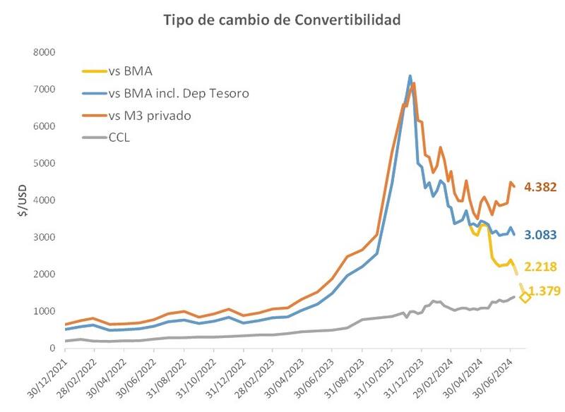 Tomando los datos del último balance semanal del BCRA, los otros depósitos del Tesoro alcanzaban al 7 de julio los 13,9 billones de pesos. De este modo, contabilizando la cuenta de liquidez del Tesoro como parte de la base monetaria amplia, vemos que el tipo de cambio de convertibilidad continúa ubicándose en torno a los 3.000 $/USD, 235% por encima del tipo de cambio oficial y también significativamente más alto que los valores del dólar paralelo.