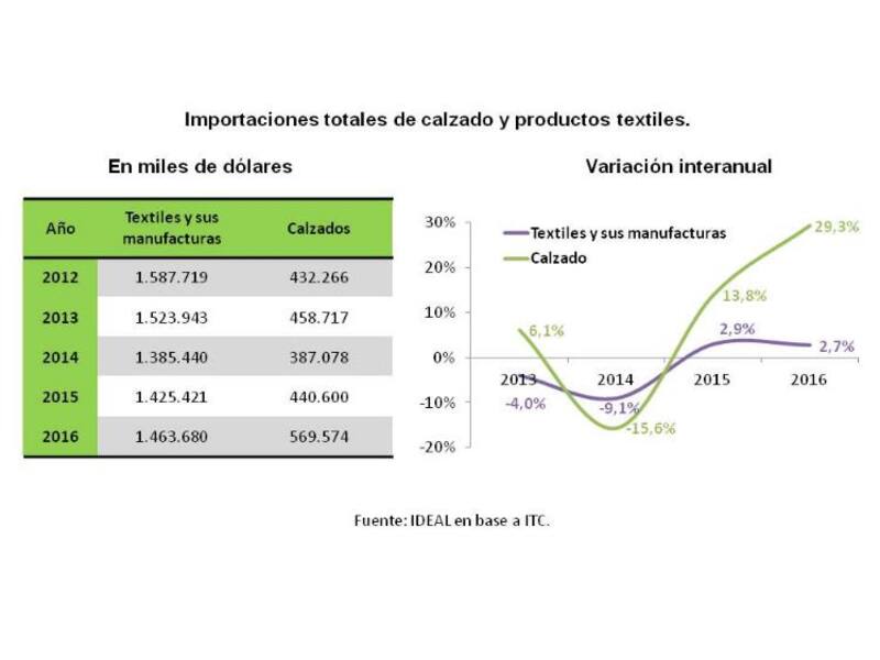 La situación en el primer trimestre de 2017 fue similar a la de 2016, aumentaron las importaciones de productos textiles y sus manufacturas (9% en dólares y 2% en cantidades); y las de calzado (32% en dólares y 22% en cantidades).