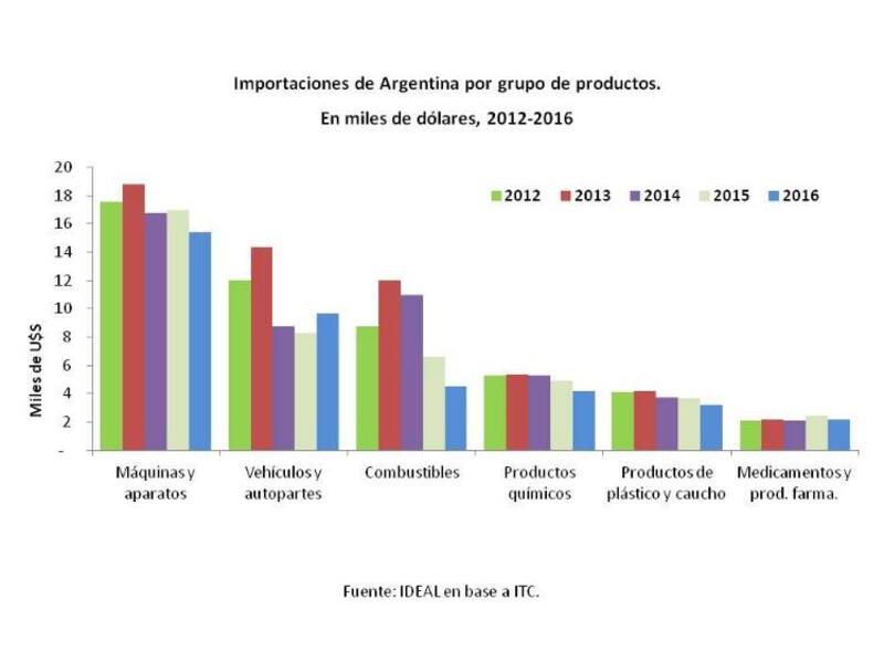 Si uno observa lo que sucedió con las importaciones totales en el último lustro, ve que el último año en el cual aumentaron fue 2013 y en los últimos tres años las importaciones totales cayeron. En 2016 hubo importaciones por un total de u$s 55.608 millones (similar a lo importado en 2008). De este total, 15.475 millones correspondieron a bienes intermedios (28%); 12.136 millones a bienes de capital (22%); 11.178 millones a piezas y accesorios de bienes de capital (20%); 7.399 millones a bienes de consumo (13%); 4.893 millones a combustibles y lubricantes (9%) y 4.469 millones a vehículos (8%).