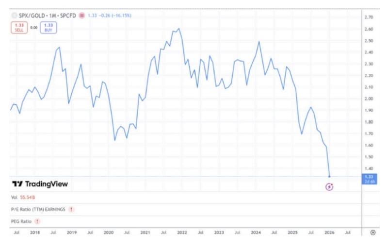 Como se muestra en el gráfico de la relación S&P 500 / Oro , desde 2013 no se observaba una relación tan baja entre el SPYy el GLD. En episodios anteriores, niveles similares estuvieron más asociados a valuaciones muy deprimidas en acciones que a una fortaleza estructural del oro.