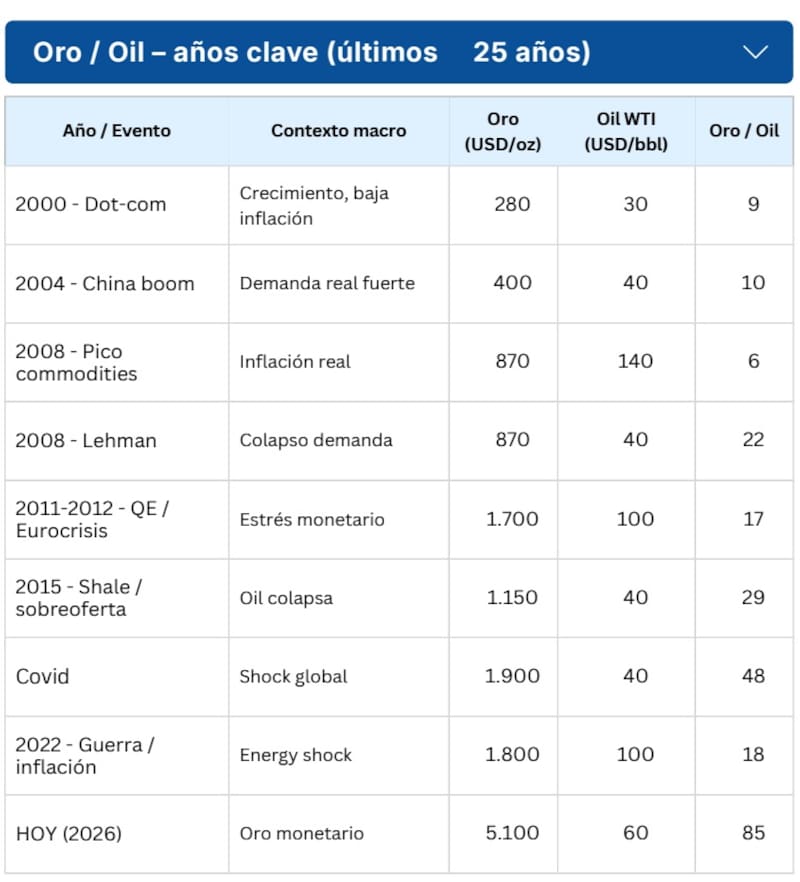 Asimismo,el cuadro histórico Oro / Petróleo muestra que el ratio actual se ubica en niveles extremos en comparación con los últimos 25 años, lo que refuerza la idea de que gran parte del movimiento responde a un fuerte repricing monetario y a flujos hacia activos de cobertura