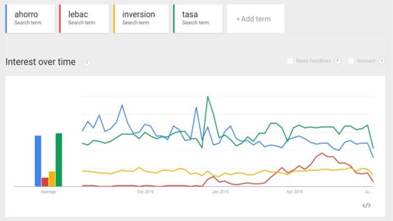 Tomando en cuenta otros términos afines se encuentran otras conclusiones interesantes: la palabra "Lebac , por ejemplo, tiene una escasa cantidad de búsquedas comparado con los otros términos, pero mostró un crecimiento impresionante. "Tasa y "ahorro tuvieron comportamientos similares a lo largo de los últimos 12 meses, e "inversión se mantuvo constante.