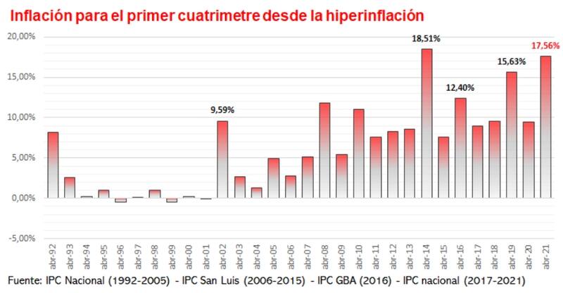 El INDEC dio a conocer el nuevo dato de inflación y abril arrojó un avance en el nivel de precios del 4,1%. De esta manera, la inflación acumulada del año es 17,6%, pero un astronómico 46,3% en términos interanuales. El gobierno viene lidiando con elevados números de inflación y hace cinco meses que no logra que se ubique por debajo del 3,5%. Para peor, todos estos números se obtienen con tarifas pisadas, precios cuidados, etc. En otras palabras, existe un alto nivel de inflación reprimida que eventualmente llegará tarde o temprano. No es un dato menor que la inflación núcleo haya sido del 4,6% mensual.