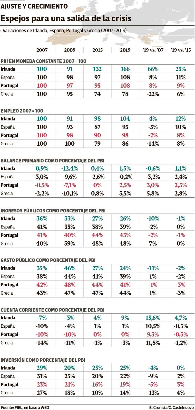 El país más exitoso por lejos de los cuatro, Irlanda, tendrá este año un Estado que ha reducido su peso en la economía en un tercio respecto del punto de partida. Los ingresos públicos que eran 36% del PBI en 2007 serán 26% este año, mientras que el gasto se redujo en 11 puntos del PBI.