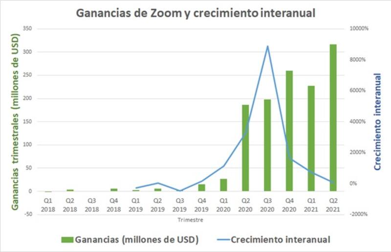 En los siguientes gráficos les voy a mostrar las ventas y ganancias de Zoom por trimestre, y su crecimiento en comparación con el trimestre del año anterior.