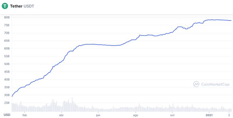 Pero la gráfica de USDT muestra una conducta más natural, además que puede ser validada en sus informes de transparencia, de hecho no se ve ningún incremento particularmente sospechoso, es por esto que vemos que el transcurso del año hay periodos bastante planos.