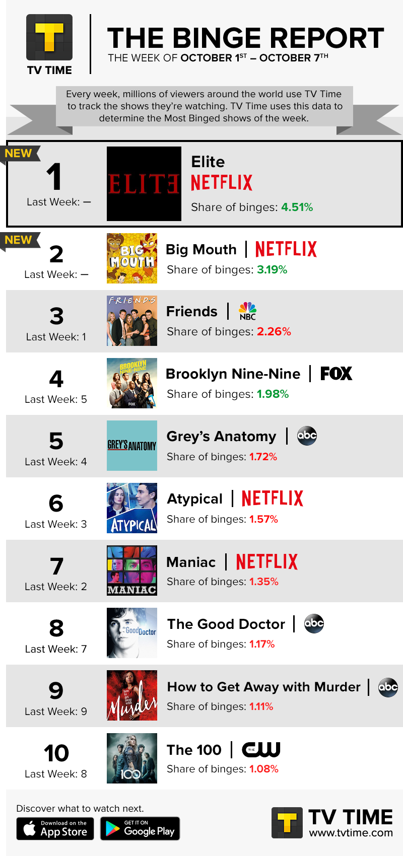 Efectivamente, de acuerdo con TV Time, al considerar la semana del 1 al 7 de octubre, “Élite fue la serie más "bingeada" con una tasa de 4,51% de "maratones".
