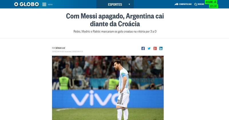 El diario brasileño puso el foco de la derrota en la floja actuación de Lionel Messi. "Con un Messi apagado, Argentina cayó 3 a 0 contra Croacia", tituló O Globo.