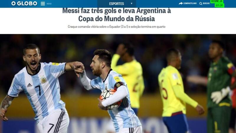 "Messi hace tres y lleva a Argentina a la Copa del Mundo de Rusia", fue el título elegido por O'Globo de Brasil.