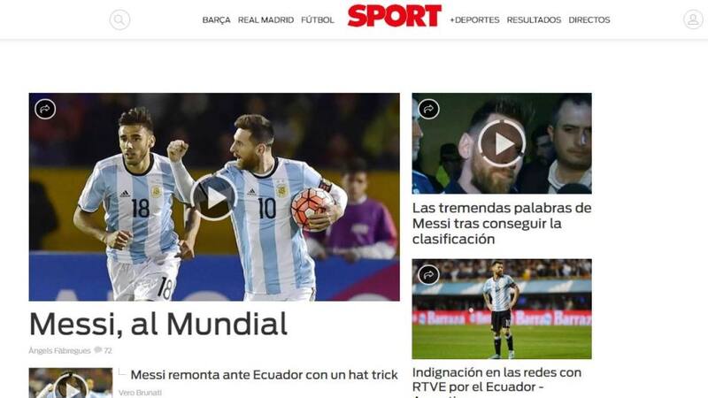 "Un Messi sublime mete a Argentina en el Mundial", fue el título que eligió el portal Mundo Deportivo, con una fotografía en la que se ve al rosarino tomando la pelota rápidamente tras convertir el empate transitorio en Quito.