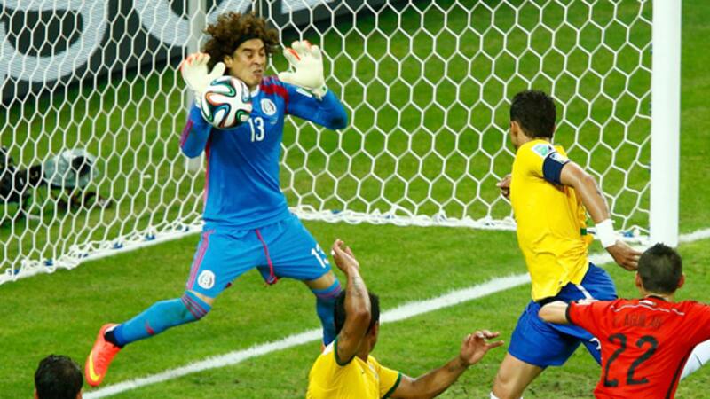 La acción más espectacular de Ochoa se observó cerca del final del partido, cuando consiguió sacar un cabezazo a quemarropa del defensor brasileño Thiago Silva, desde dentro del área chica.