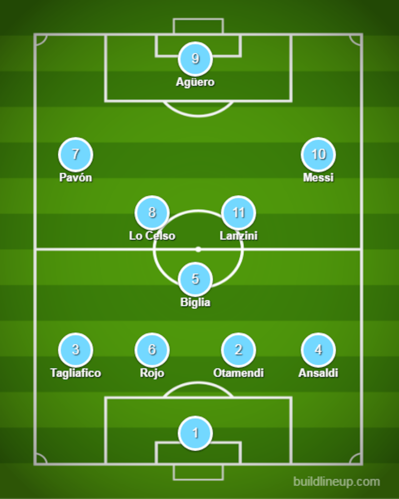 En realidad, Sampaoli llevó adelante un entrenamiento táctico con sólo 10 jugadores. El mismo alineó en un principio a Cristian Ansaldi, Nicolás Otamendi, Marcos Rojo, Nicolás Tagliafico; Giovani Lo Celso, Lucas Biglia, Manuel Lanzini; Cristian Pavón, Lionel Messi, y Sergio Agüero.