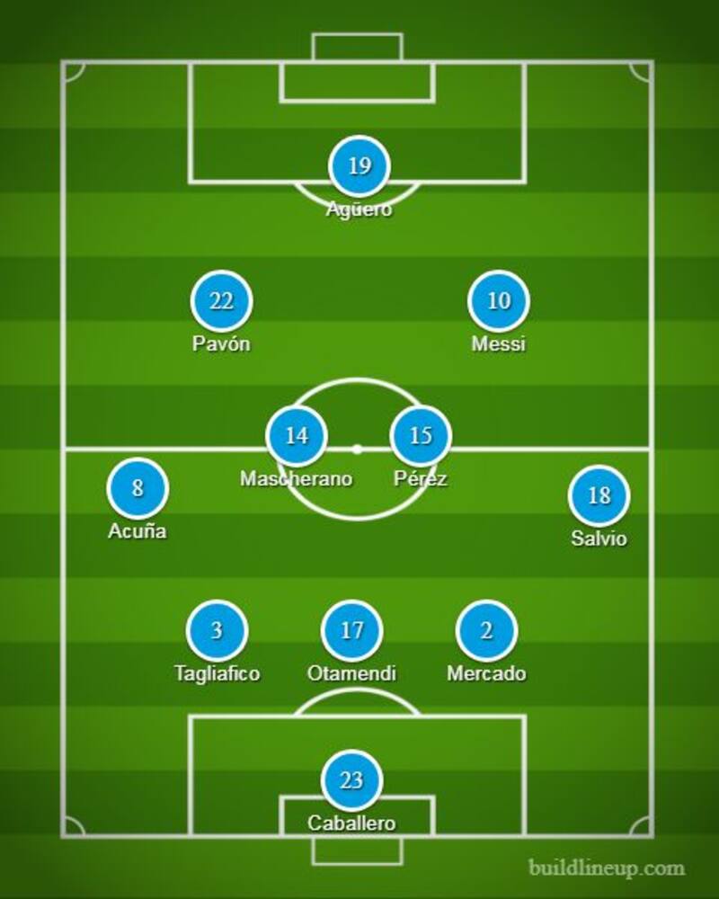 Si bien Caballero continuará en el arco, pese a su irregular rendimiento en el debut, en esta ocasión estará resguardado por 5 futbolistas, pese a que aquellos laterales carrileros se presume que se sumarán al mediocampo cuando el equipo argentino tenga la posesión de la pelota.