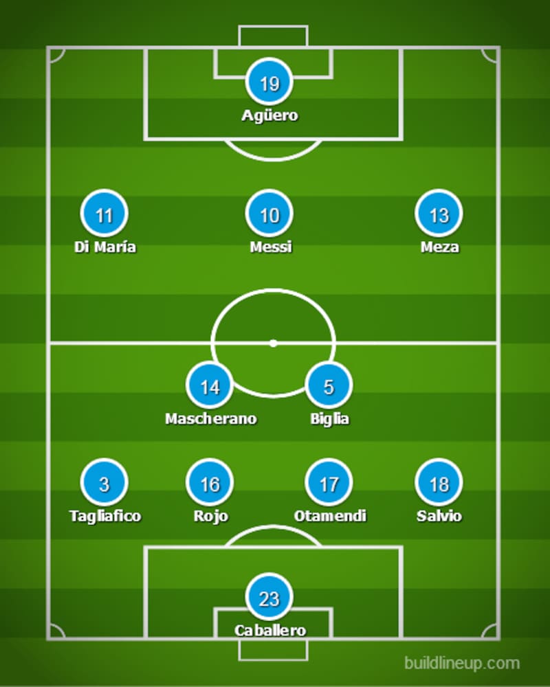Delante de los dos mediocampistas centrales, volvieron a aparecer Maximiliano Meza, ocupando el lugar que dejó vacante Manuel Lanzini por la derecha, Messi por el centro y Angel Di María por la banda izquierda.