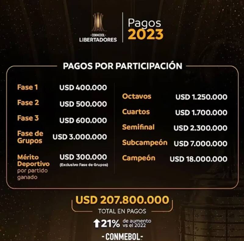 En mayor o menor medida, el incremento en el negocio del fútbol también suele desembocar en la suba de los premios que se pagan a los equipos participantes de los torneos. La Conmebol no es la excepción, y para 2023 se determinó un aumento promedio del 23% en los montos que se abonarán a los conjuntos que disputen la Copa Libertadores y la Copa Sudamericana.
