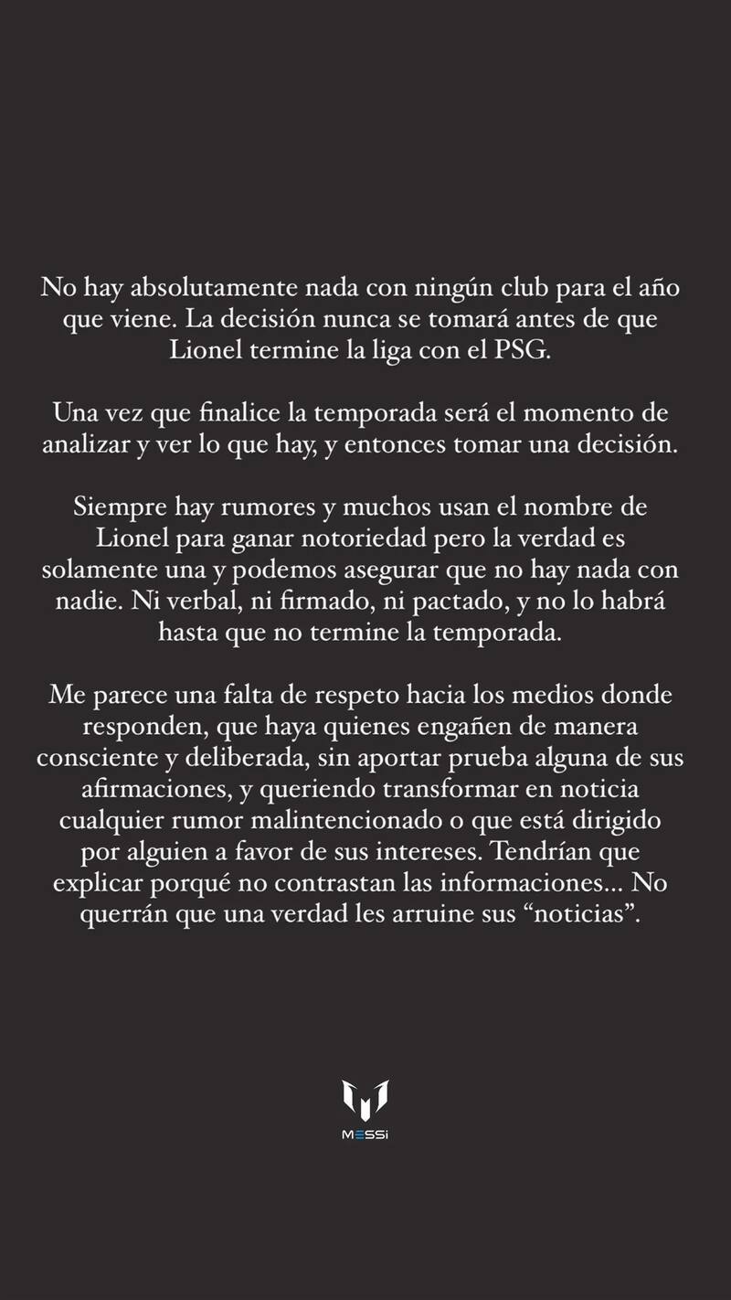 "No hay absolutamente nada con ningún club para el año que viene", remarcó en redes sociales al tiempo que aseguró: "La decisión nunca se tomará antes de que Lionel termine la liga con el PSG. Una vez que finalice la temporada será el momento de analizar y ver lo hay".