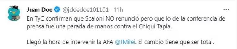 En las últimas horas, Juan Doe, un usuario de "X", compartió: "En TyC confirman que Scaloni no renunció, pero que lo de la conferencia de prensa fue una parada de manos contra el Chiqui Tapia", redactó.
