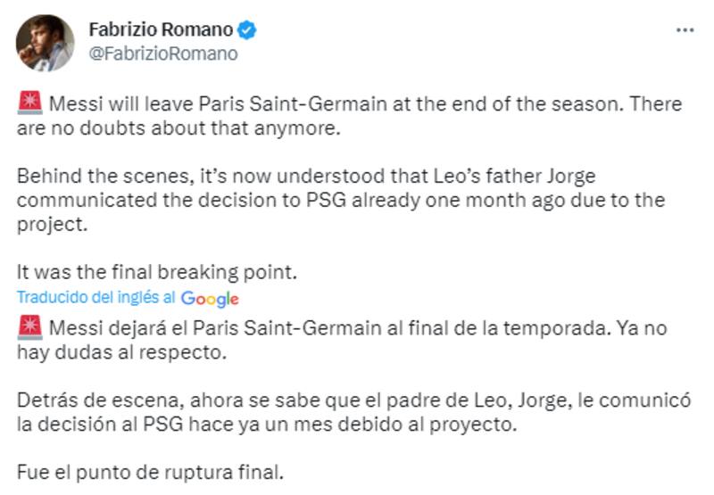 Según confirmó el principal periodista en los traspasos futbolísticos Fabrizio Romano, Messi dejará París y que "hay una ruptura final" en la relación entre ambos.