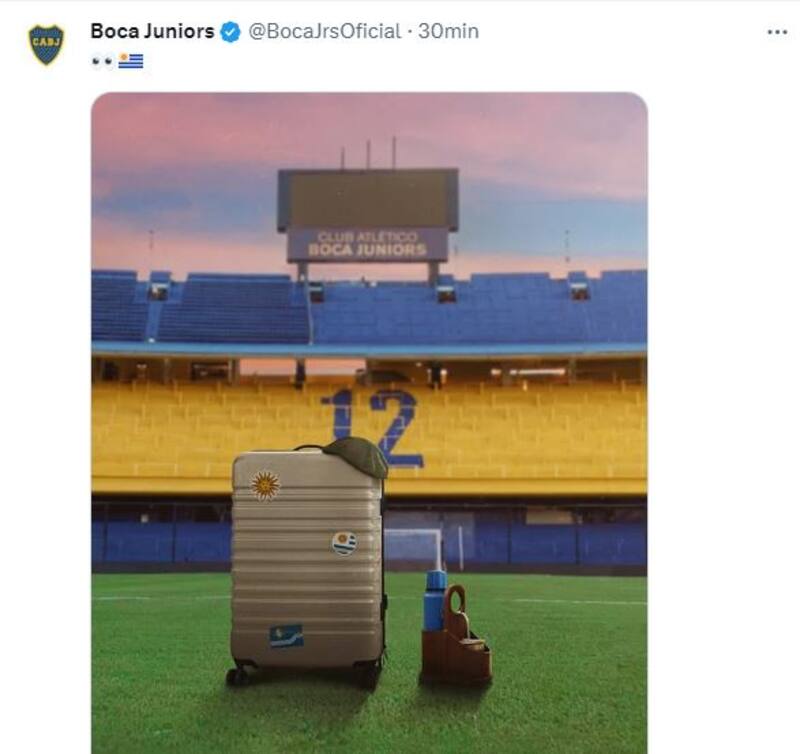 El club compartió la noticia de una manera particular: la foto de una valija en la Bombonera con claras referencias al jugador: un equipo de mate, una boina y un sticker con la bandera del país.
