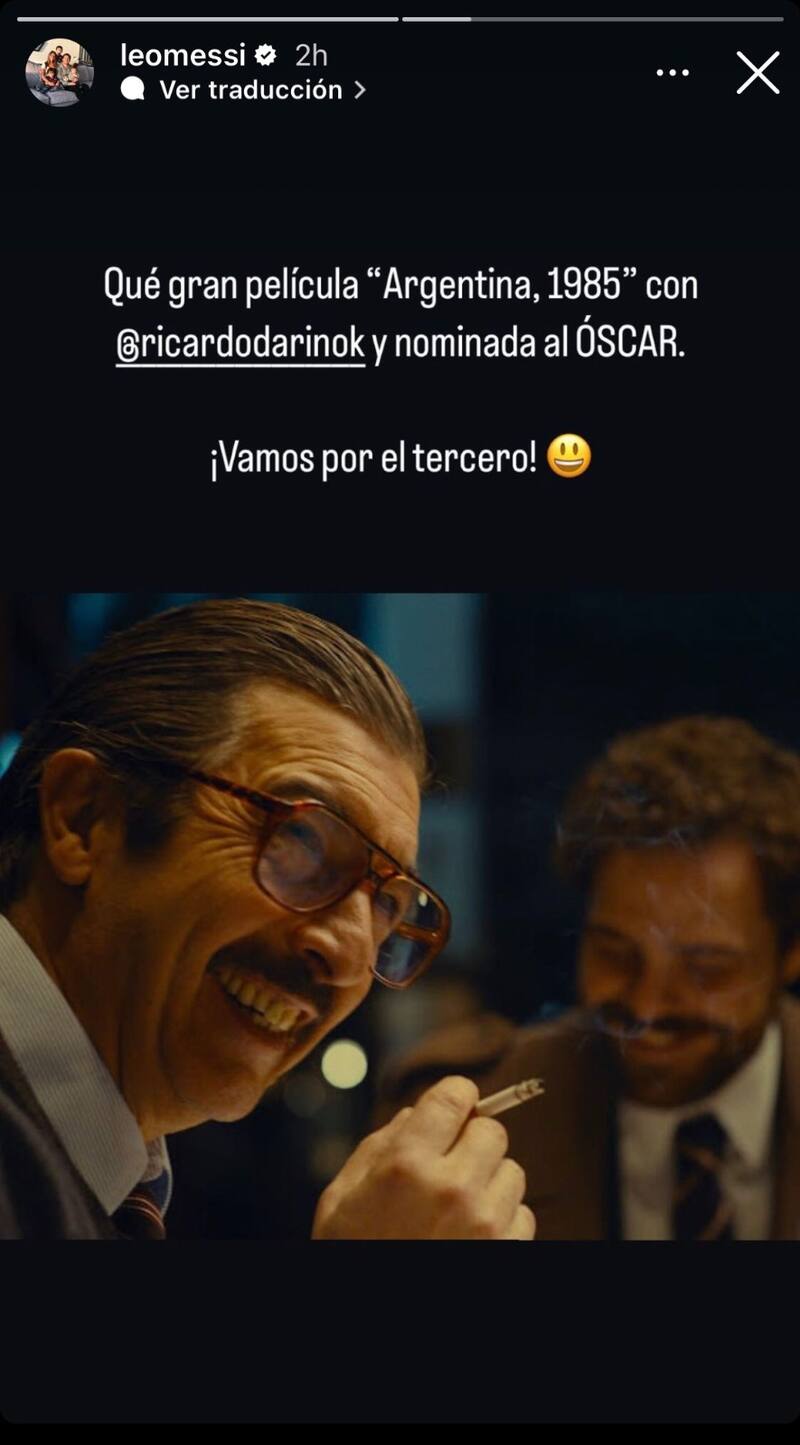 "Argentina, 1985", la película dirigida por Santiago Mitre y protagonizada por el Darín y Peter Lanzani está en carrera por ganar la estatuilla. La reputación en el ambiente del cine es extremadamente positiva, pero también desde otros sectores elogian la trama. "Qué gran película "Argentina 1985" con @ricardodarinok y nominada al OSCAR. ¡Vamos por el tercero!", escribió la Pulga, enalteciendo el film que reconstruye el histórico juicio a las juntas militares que tuvo lugar después de la última dictadura.