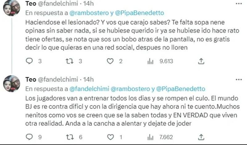 "Tranquilos que él ama a Boca! Dio todo por la camiseta, está donde quiere estar", "El esfuerzo que hizo Darío por Boca muy pocos lo han hecho", "Qué anti Boca que son. Ojalá la verdad salga a la luz!!!", son solo algunos de los tuits que el usuario @fandelchimi publicó en la plataforma del Pajarito.