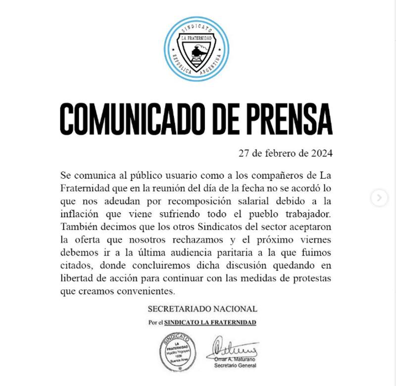 En el comunicado, el sindicato liderado por Omar Maturano señaló que en la reunión del día de la fecha no se alcanzó un acuerdo respecto a la recomposición salarial, alegando la necesidad urgente de compensar el impacto de la inflación en los ingresos de los trabajadores. Mientras tanto, otros sindicatos del sector aceptaron una oferta que La Fraternidad rechazó, exacerbando la discrepancia y la incertidumbre sobre el futuro de las negociaciones.