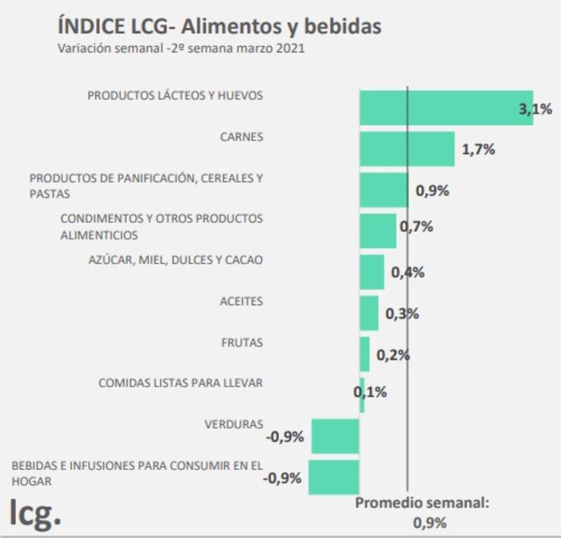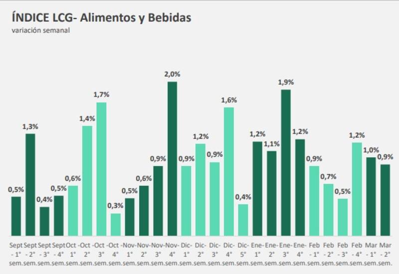 El informe de avance de inflación en alimentos y bebidas, que elabora semanalmente la consultora LCG, destaca que en la segunda semana de marzo, que finaliza hoy, la "suba de precios de los alimentos promedió 0,91%, desacelerándose 0,09 puntos porcentuales respecto a la semana anterior".