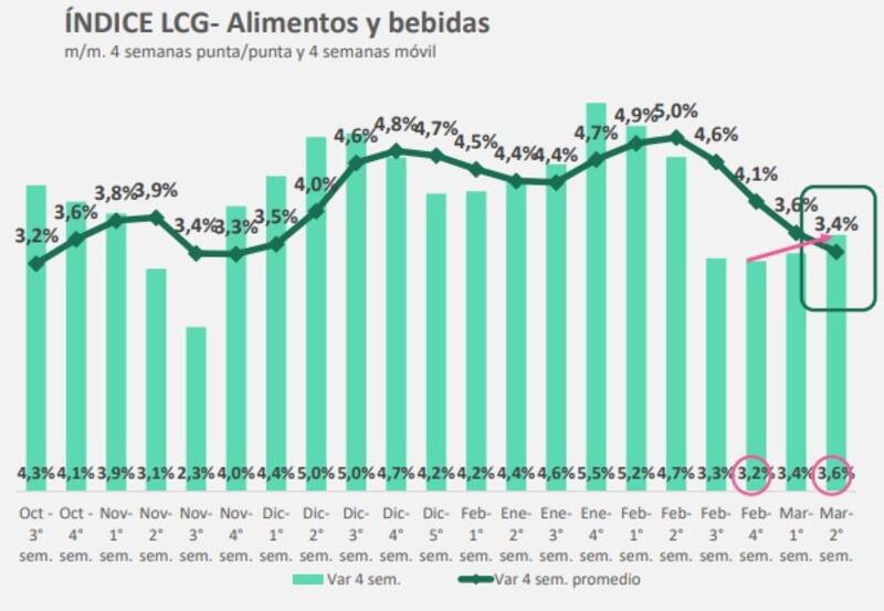 De este modo, el índice acumula una inflación mensual promedio de 3,4% en las últimas cuatro semanas y llega a 3,6%, en la medición punta a punta. Hace dos semanas el promedio mensual estaba en 3,2%, por lo que se observa un avance de la inflación en alimentos y bebidas.