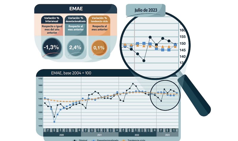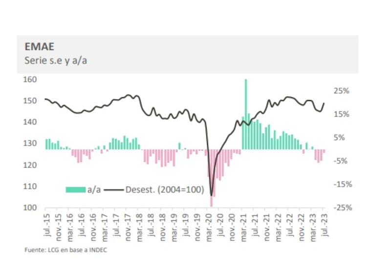 En el mes de julio de 2023, el Estimador mensual de actividad económica (EMAE) experimentó una disminución del 1,3% en comparación con el mismo período del año anterior, mientras que mostró un incremento positivo del 2,4% en relación al mes de junio en la medición desestacionalizada. Esta suba "sorprendió por lo positivo", advirtió la consultora LCG, en un informe distribuido hoy.
