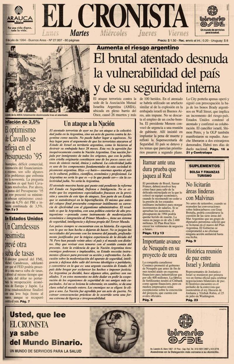 A pesar de ser un diario exclusivamente financiero, El Cronista se hizo eco de lo sucedido y tituló: "El brutal atentado desnuda la vulnerabilidad del país y de su seguridad interna".