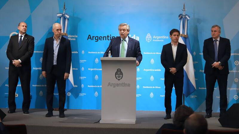 Acompañado por el gobernador Axel Kicillof (Buenos Aires), Gerardo Morales (Jujuy), Omar Perotti (Santa Fe) y el jefe de Gobierno porteño Horacio Rodríguez Larreta, Fernández comenzó su discurso remarcando que "la salud para nosotros es muy importante por eso hemos tomado el toro por las astas desde el comienzo". "Nos hemos abocado a dar respuestas rápidas aprovechando que Dios nos dio una oportunidad dándonos tiempo para prevenir el avance del virus , indicó.