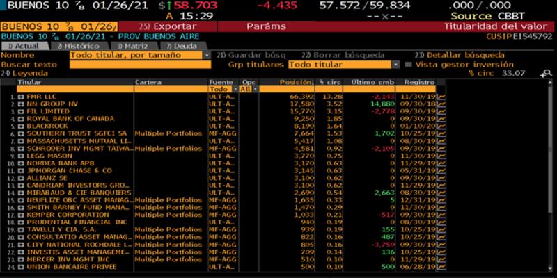 Así se desprende del listado que surge de Bloomberg, aunque también pueden aparecer otros fondos de inversión global (hedge funds) que no informan sus tenencias. Tampoco se detallan en dicho listado las tenencias del sector público sobre el bono en cuestión.