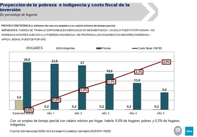 En su informe, proponen un plan quinquenal de generación de 4 millones de empleo (unos 800.000 puestos por año) que tendría, según estimaron, un costo fiscal de 2,9% en total. Los cálculos contemplan que cada puesto sería de tiempo parcial con una remuneración proporcional al salario mínimo, vital y móvil.