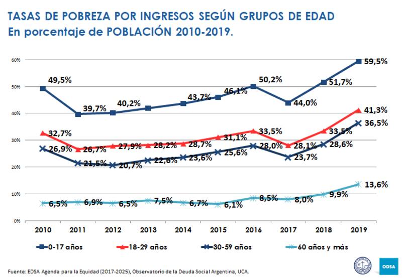 En la franja de entre 18 y 29 años la pobreza afecta al 41,3% y la indigencia, al 9%; en tanto que a la población de entre 30 y 59 años el alcance es de 36,5% y 6,9%, respectivamente. Entre los mayores de 60 años, el 13,6% es pobre y el 1,8% está por debajo de la línea de indigencia.